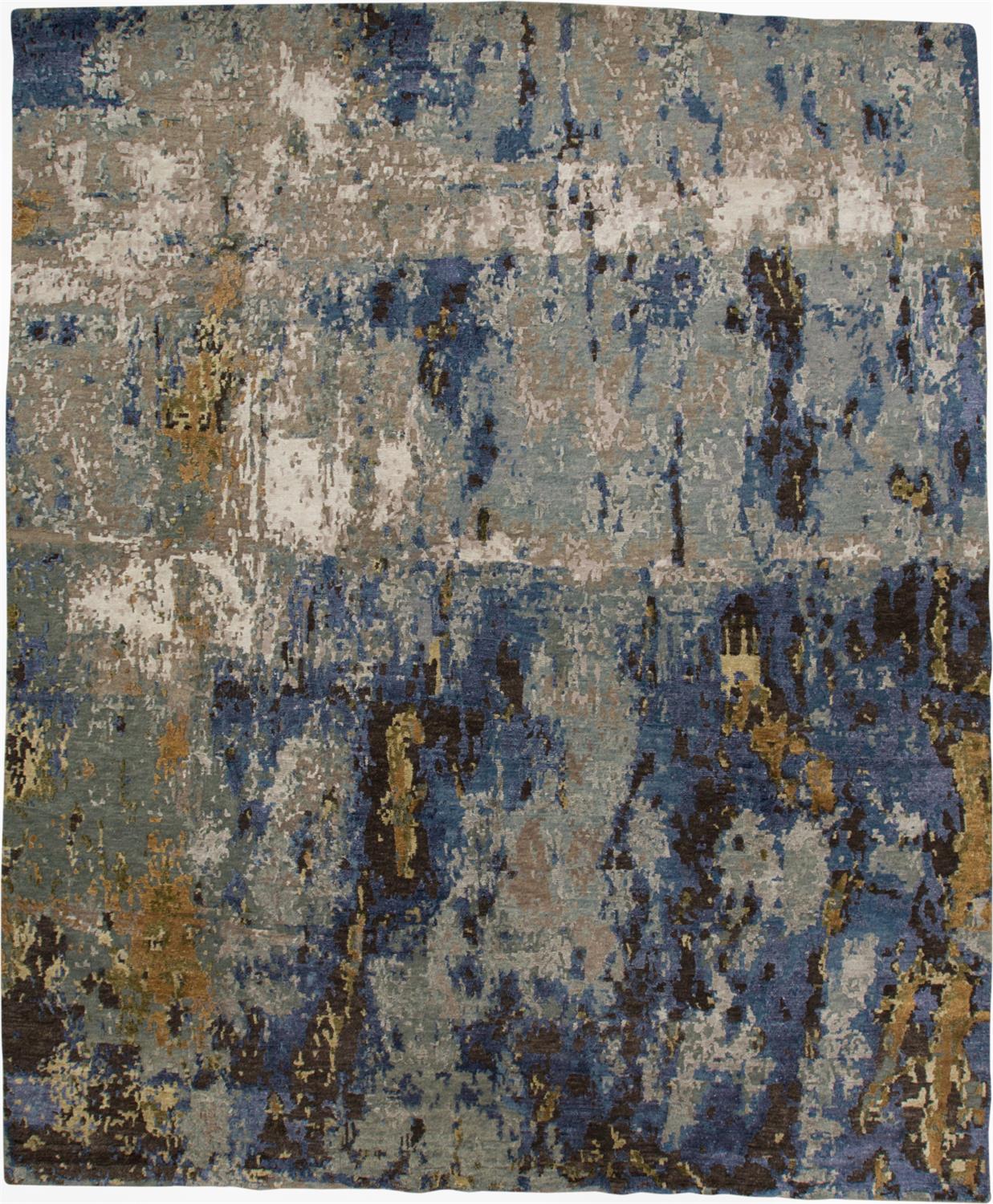 Layered contrasting hues create pieces of stunning textural interest in the Lor Collection. Hand-knotted in a wool and viscose pile each abstract design features pops of bold accent colors against serene backdrops of gray camel and silver.